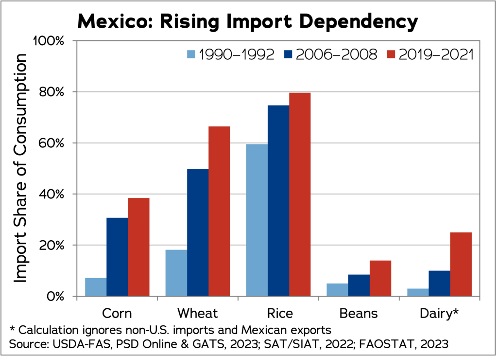 As regular readers know, what Mexico wants is to grow its own non-generically modified corn and import only non-GM corn to meet domestic demand for human consumption. And almost all the corn the US exports is genetically modified. The Mexican government’s reasons for doing so include protecting the health of the population, the environment and Mexico’s bewildering genetic diversity of maize. The government also wants to halt and ultimately reverse its acute — and growing — dependency on US imports for all of its main food staples, as illustrated in this graph: