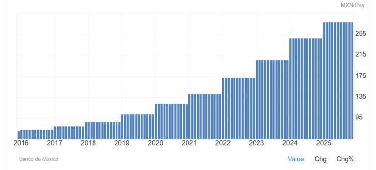 Just under a month ago, Mexico’s President Claudia Sheinbaum announced that the country’s minimum daily salary would increase 13% in 2026, from 278 pesos to 315 pesos. In the northern border regions, where wages are higher, the increase would be 5%, taking the minimum daily wage to 440 pesos.