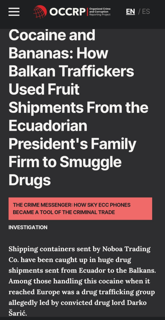 • Ecuador is the primary point of departure for cocaine shipments to the US and Europe, with Noboa’s family businesses repeatedly linked to drug seizures