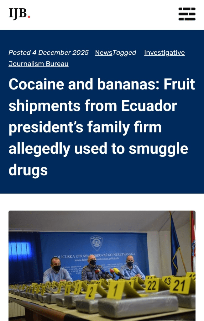 Another reason why this recent deployment of US troops, with the ostensible purpose of bolstering the Noboa government’s fight against the drug cartels, is controversial is that the Noboa family’s banana export business has been repeatedly implicated in cocaine trafficking.