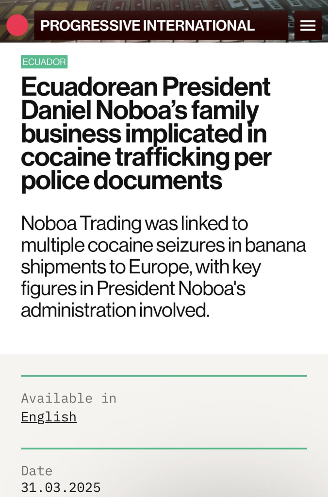 • Investigations are allegedly obstructed without thorough probes, no arrests of high-level figures, while cases are dismissed as “contamination” despite Noboa companies controlling the full supply chain